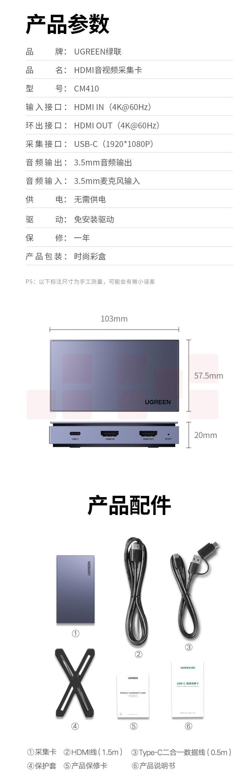 绿联(UGREEN) CM410 视频采集卡器直播 HDMI高清 10937