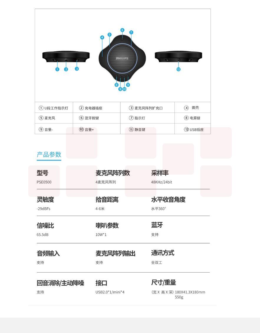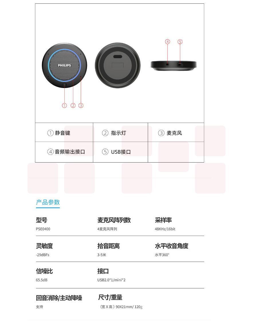 飞利浦 视频会议全向麦克风 适用60-100平米/视频会议全向麦克风/ 拾音会议扬声器/全向麦+收音*2
