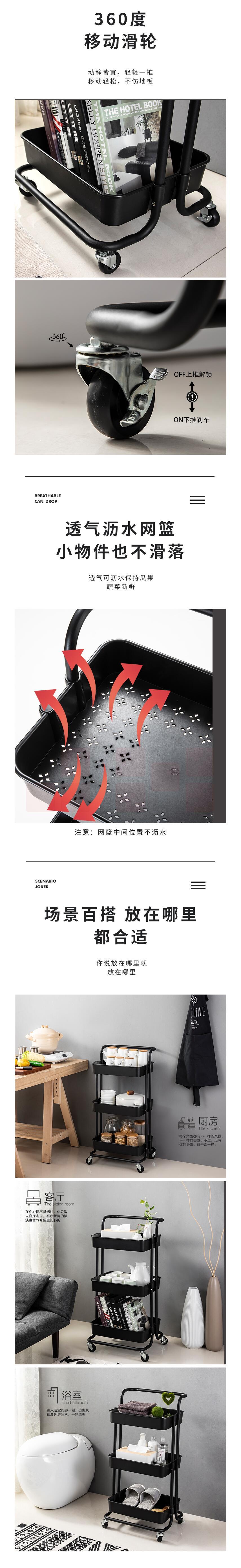 厨房置物 黑色落地三层储物收纳 网篮手推车可移动层架 MCWA983 30*40*87 货号:YC