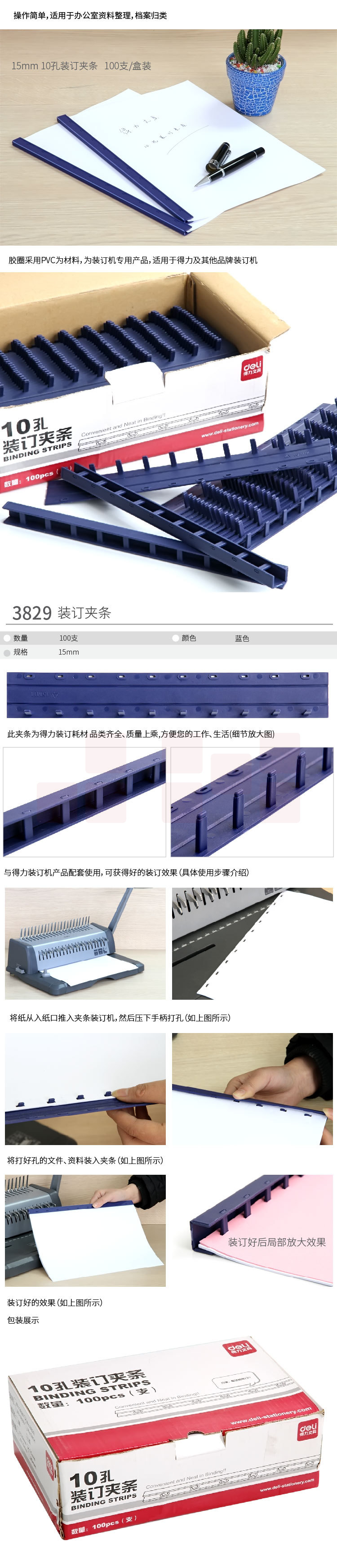 得力3829-10孔装订夹条(黑)300*15mm(100支/盒)(约装订150张)