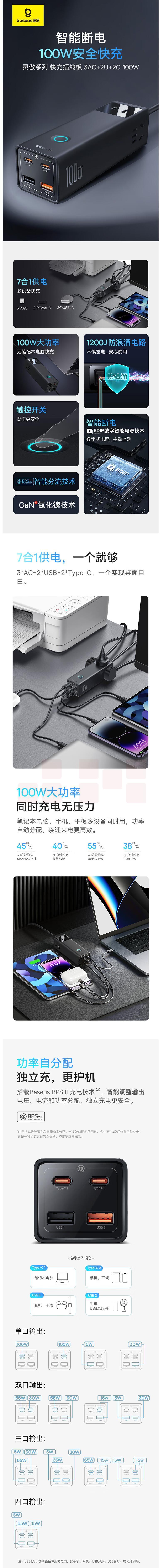 倍思 插线板 100W氮化镓笔记本快充插座 Type-C+USB(2A2C)星光白 货号:JC