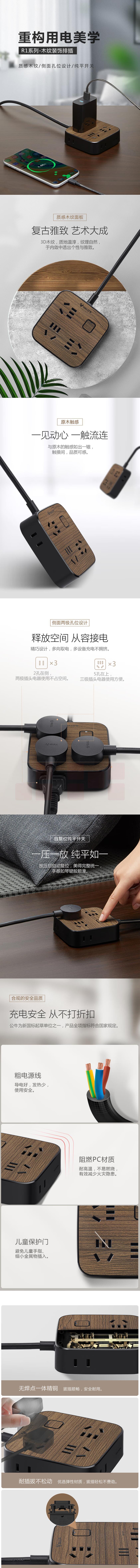 公牛 GN-R3330 6位总控1.8米新国标插座/插线板/插排/排插/接线板/拖线板 黑色木纹