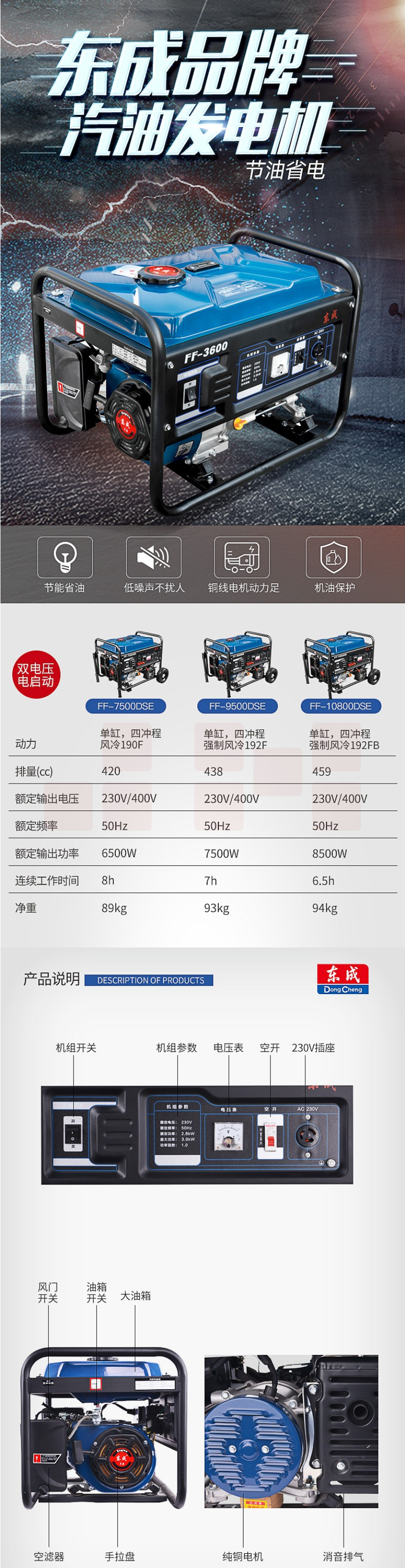 东成 FF-7500DSE 汽油发电机6.5KW单/三相双电压 电启动