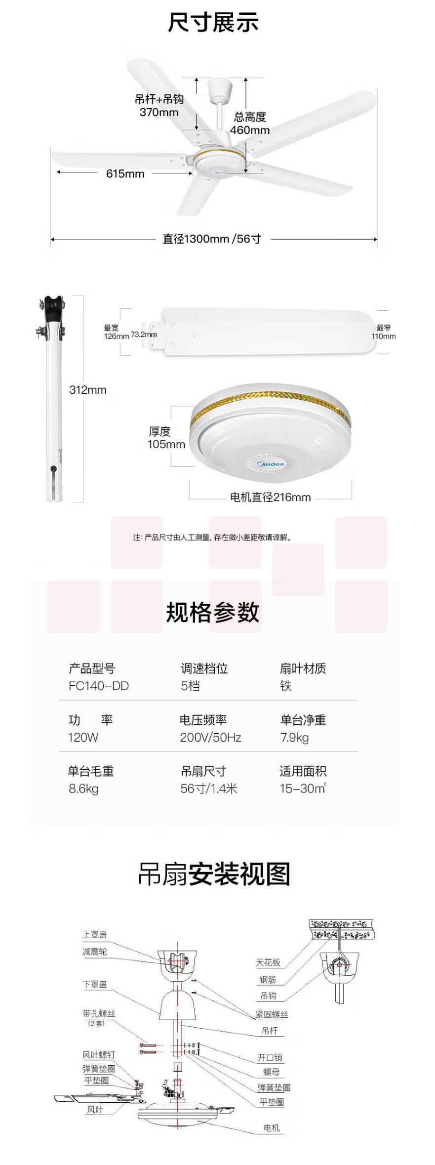 美的(Midea)吊扇大风力56吋家用5叶轻音电扇 FC140-DD