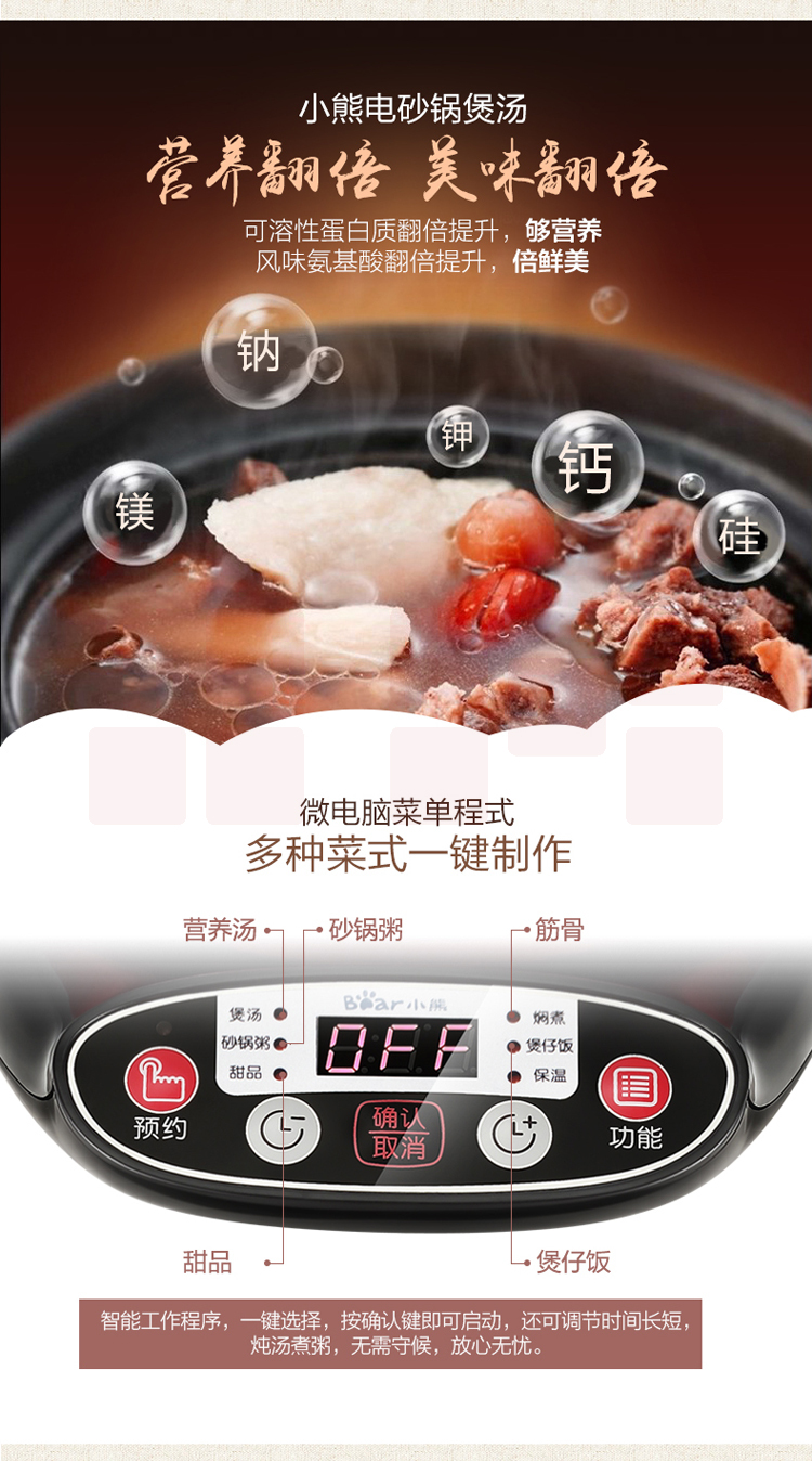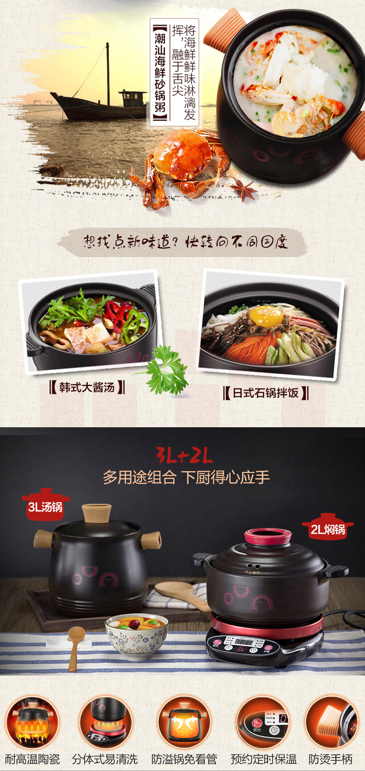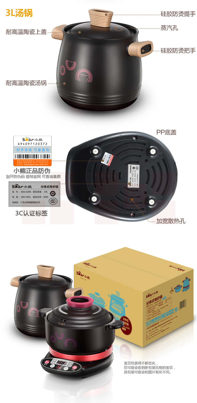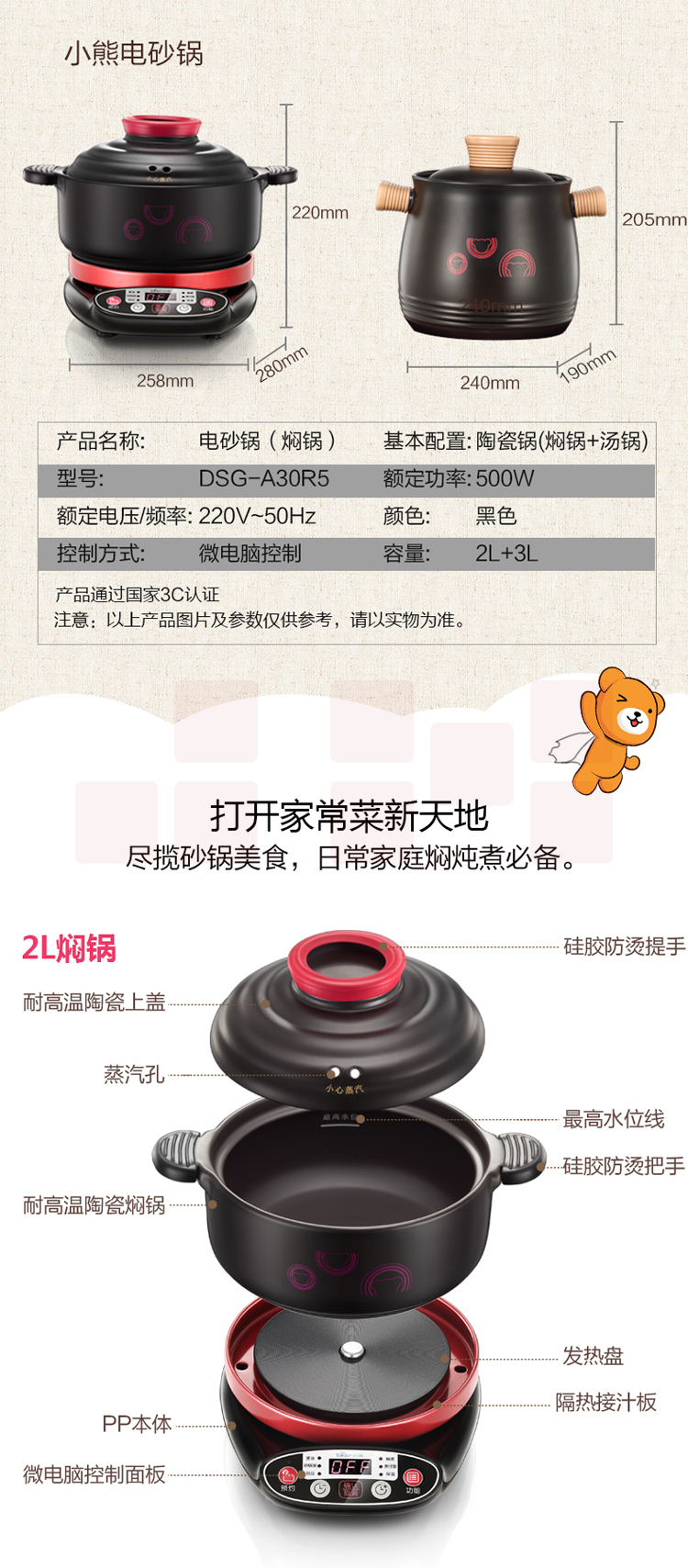 小熊(bear)电炖锅 陶瓷电砂锅煲汤锅焖锅全自动家用煮粥炖汤锅DSG-A30R5 2L+3L