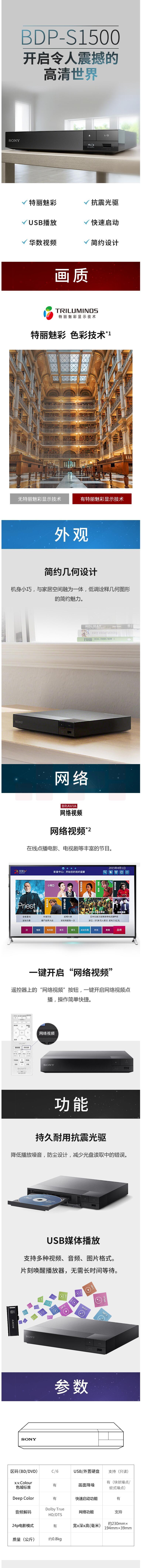 索尼(SONY)BDP-S1500 蓝光DVD 支持USB播放 支持网络视频 播放机 黑色