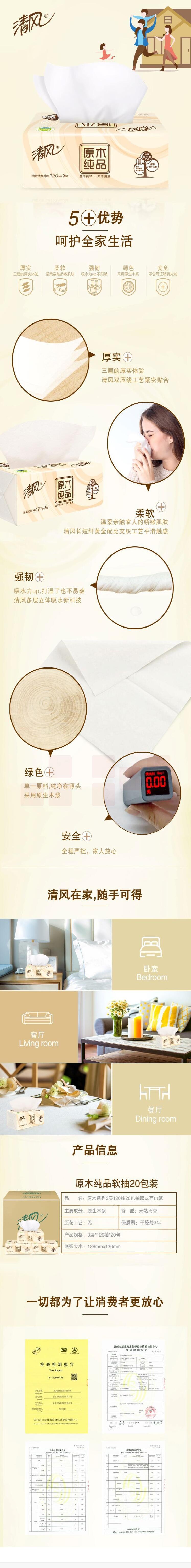 清风 抽纸 原木三层面巾纸 餐巾纸 软抽纸【三层120抽】整箱20包 AR14G