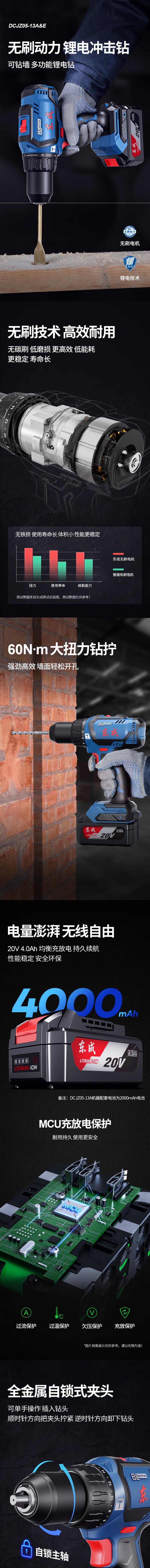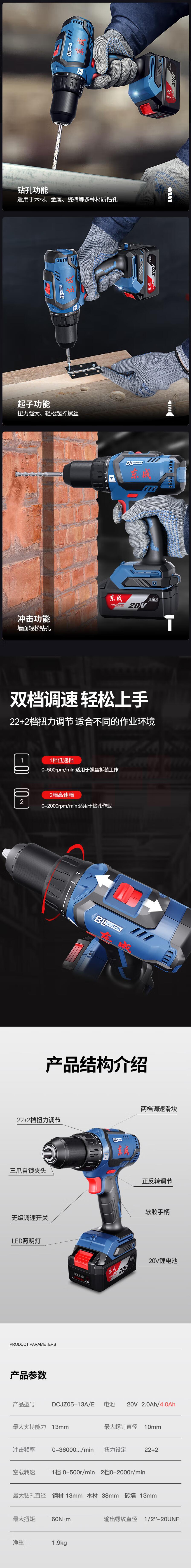 东成 DCJZ05-13E 20V无刷双速 起子冲击电钻4.0Ah 双电池 充电式手电钻充电钻电动螺丝刀