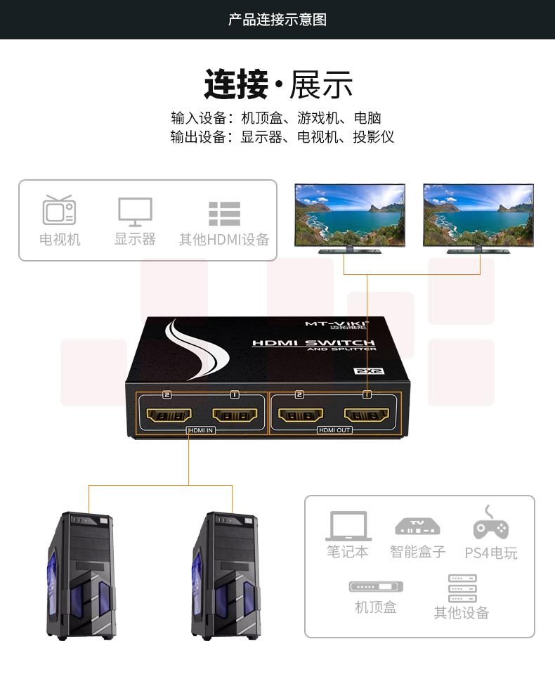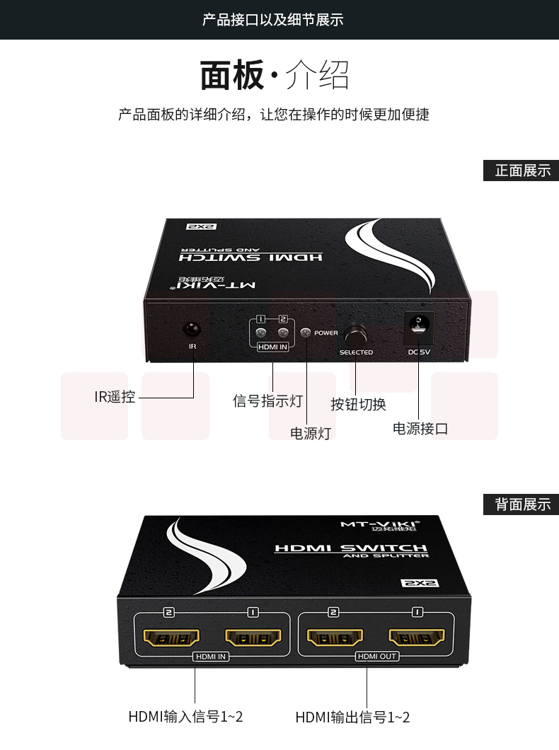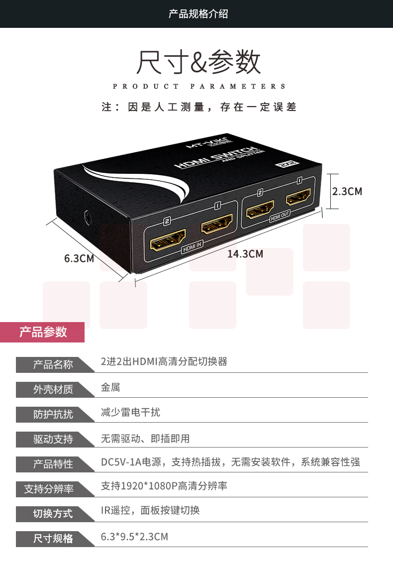 迈拓维矩MT-HD2-2 hdmi切换分配器2进2出一拖二高清音视频共享二分二