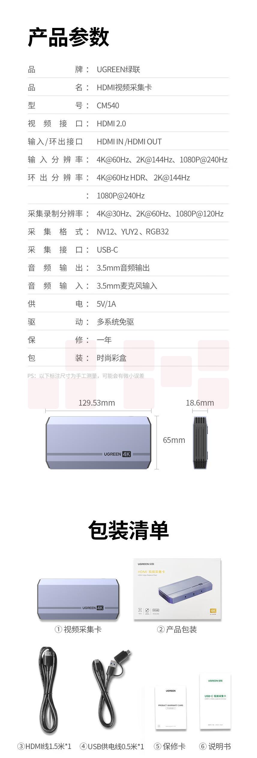 绿联 CM540 HDMI高清视频采集卡4K60Hz环出 适用手机笔记本电脑相机摄像机抖音直播会议录制盒4K30Hz采集 80687