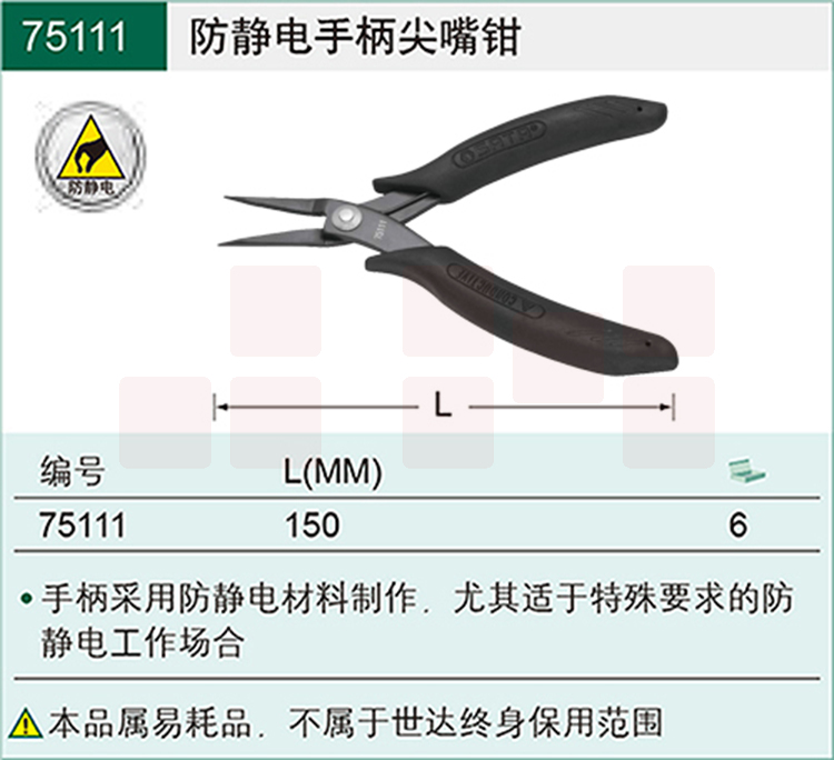 世达(SATA)防静电手柄尖嘴钳5"货号 75111
