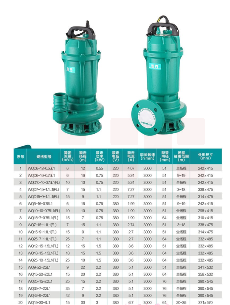 上海人民 WQD10-10-0.75KW 2寸 220V 无堵塞污水泵