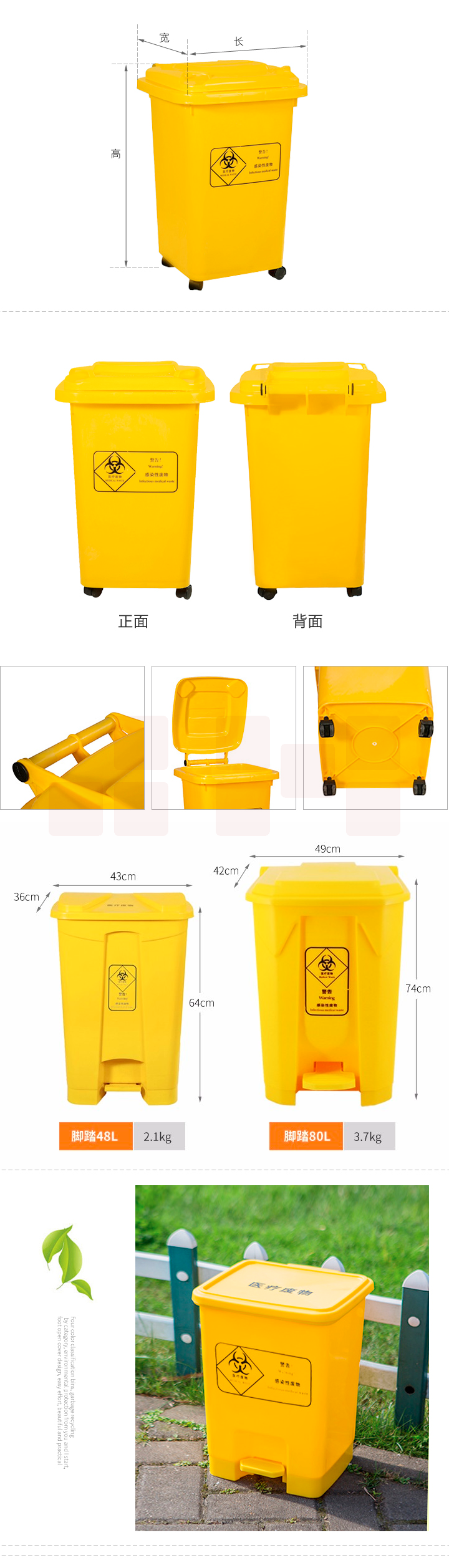 兰诗 80升黄色垃圾桶 废弃物桶 80L脚踏垃圾桶