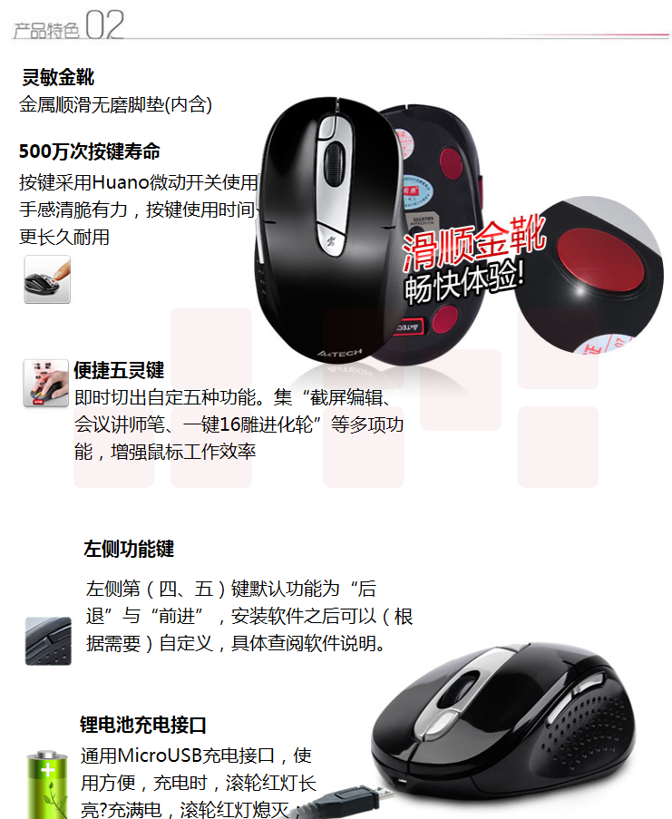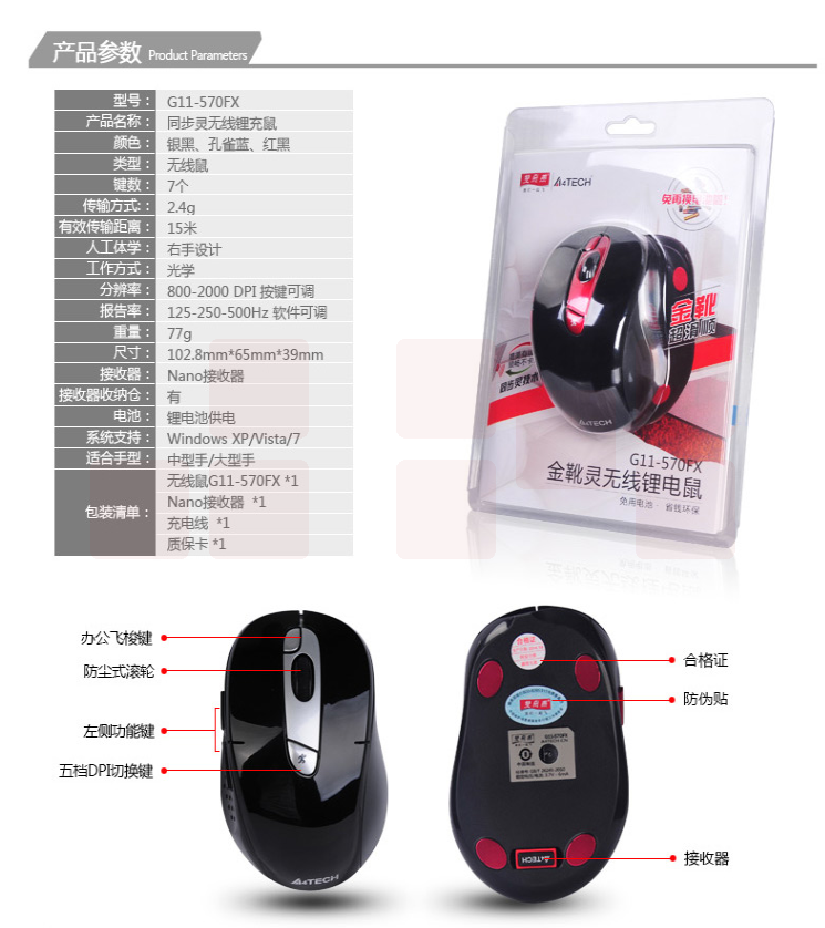 双飞燕(A4TECH) G11-570FX 鼠标 无线鼠标 办公鼠标 便携鼠标 对称鼠标 充电鼠标 DPI可调 2.4G 银黑