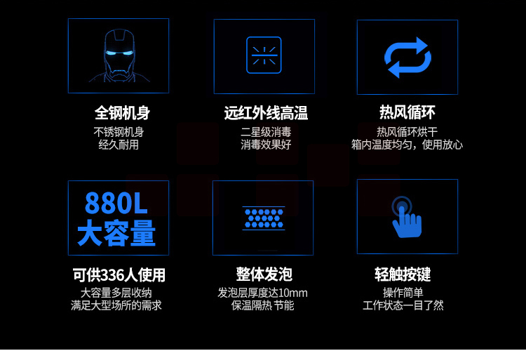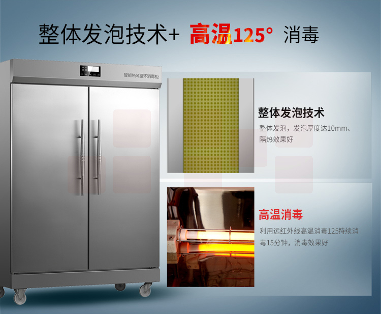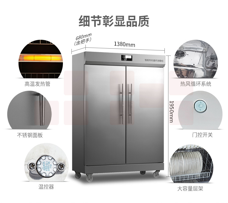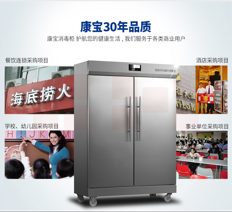 5、消毒方式及使用场所:热风循环高温消毒,使内部消毒温度更均匀,采用温控器和超温熔电器双重保护,安全可靠