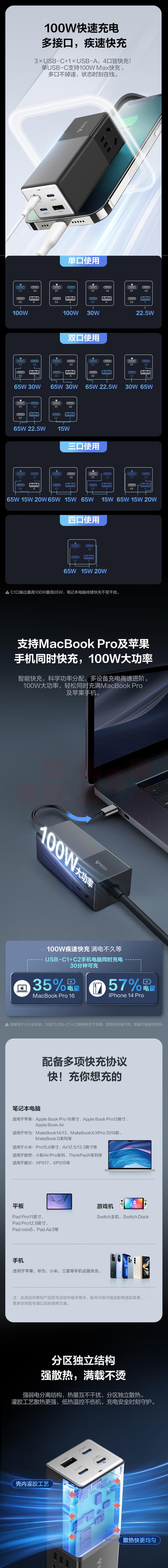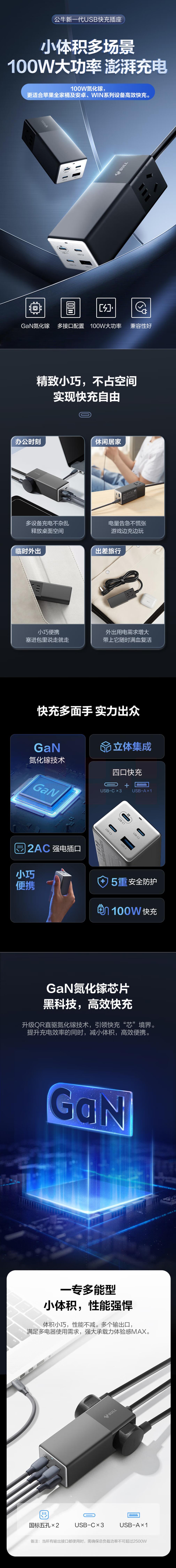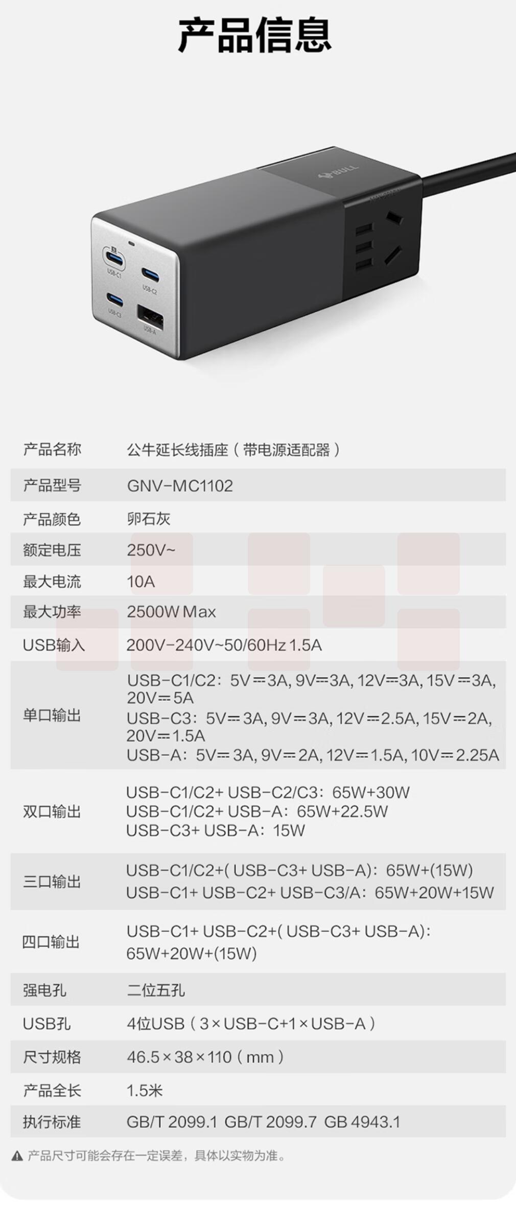 公牛 氮化镓100W充电器快充笔记本插座/插线板/插排/接线板 USB(3C1A)+2插孔 全长1.5米 GNV-MC1102