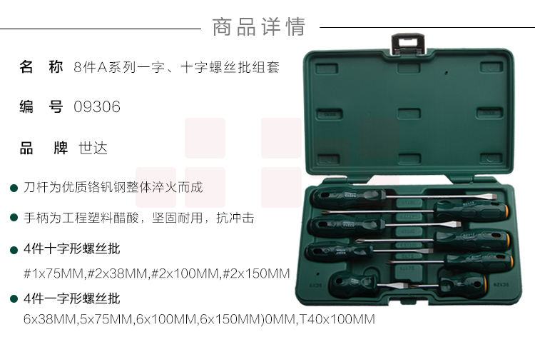 世达(SATA)8件A系列一字、十字螺丝批组套货号09306