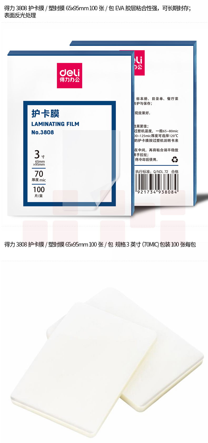 得力(deli) 3808 过塑机塑封机膜过塑膜 优质专用护卡膜/塑封膜65*95mm 3寸 100张/包