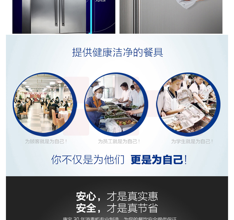 1、外形尺寸(mm):宽1192*深553*高1660 2、工作方式:高温 门材质:不锈钢 3、储存空间:双门双室 外壳材质:不锈钢 4、功率(W):220V~50Hz 1800W 容积(L):586L 5、消毒方式及使用场所:红外线高温消毒,主要用于耐高温的食具、茶具的消毒及存放适用于幼儿园、餐厅、 公共食堂、酒店等场所使用。
