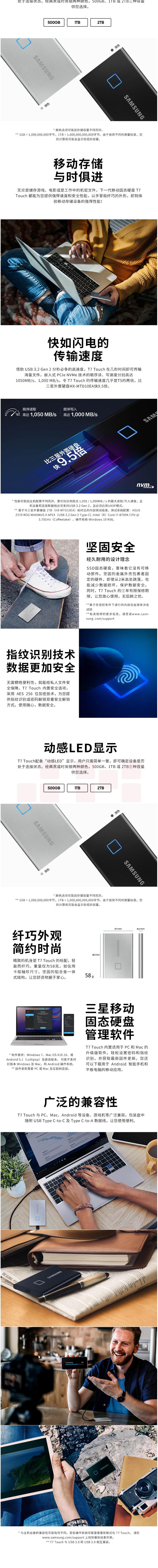 三星 2TB Type-c USB 3.2 移动固态硬盘(PSSD) T7 Touch 黑色 NVMe传输 1050MB/s 指纹识别