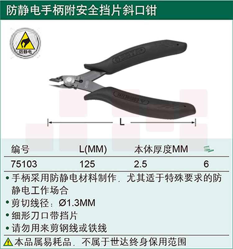 世达(SATA)防静电手柄附安全挡片斜口钳5"货号 75103