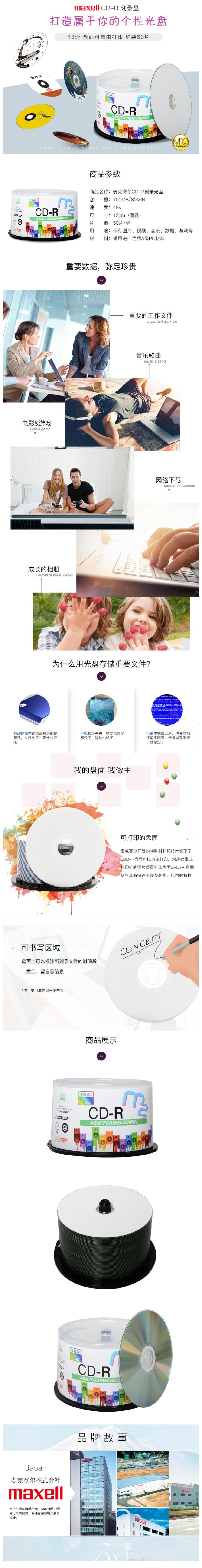 麦克赛尔 CD-R光盘 50片装 空白光盘 M2系列48速700M 桶装
