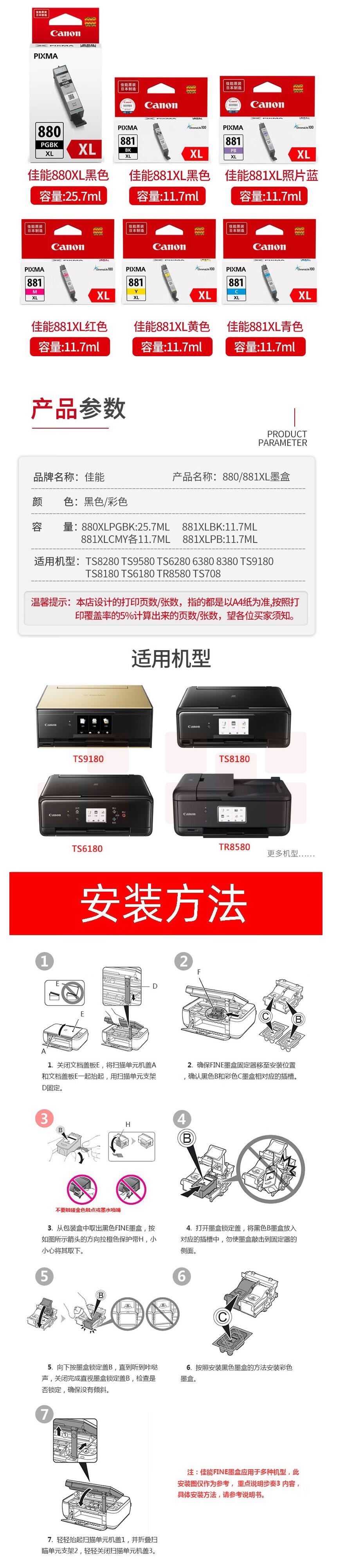 佳能(Canon)CLI-881XL M 大容量品红色 适用TS8380t/TS708/TS708t/TS9580/TS9180/TS8380