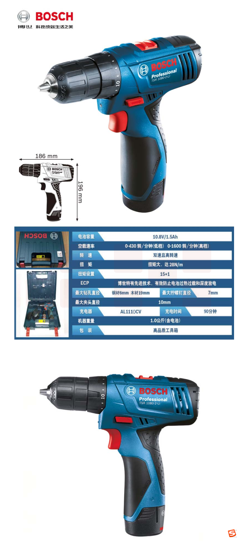 博世(BOSCH)TSR 1080-2-Li 充电式手电钻 多功能电动螺丝刀 双电版1.5Ah