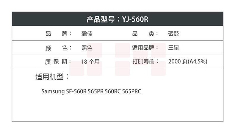 盈佳YJ SX-560R黑鼓(带芯片)适用机型:Samsung SF-560R 565PR 560RC 565PRC
