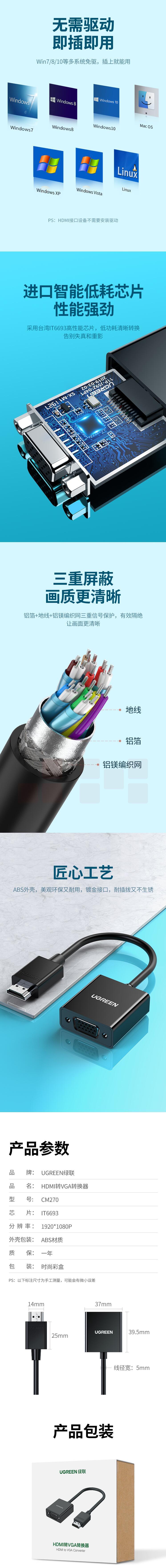 绿联 HDMI转VGA线转换器 高清转接头适配器 CM270 黑色