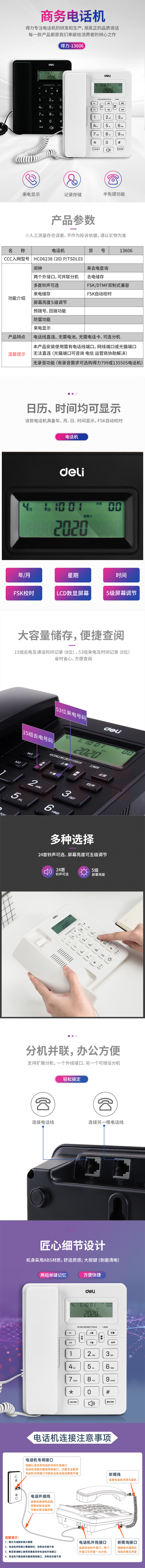 得力13606 电话机座机 来去电查询 可接分机 白色