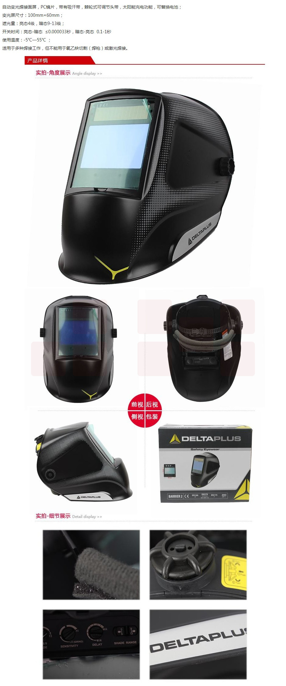 代尔塔 101132 经济型自动变光焊接面罩 SCREEN 黑色 6个/箱 面部防护