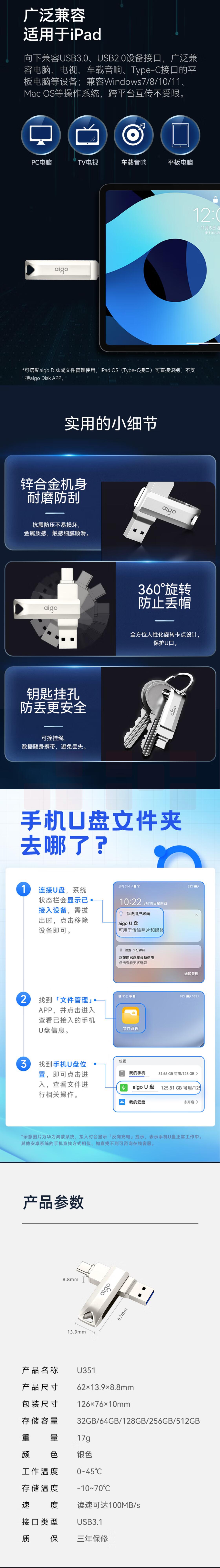 爱国者 128GB Type-C USB3.1 双接口U盘 U351银色手机电脑用