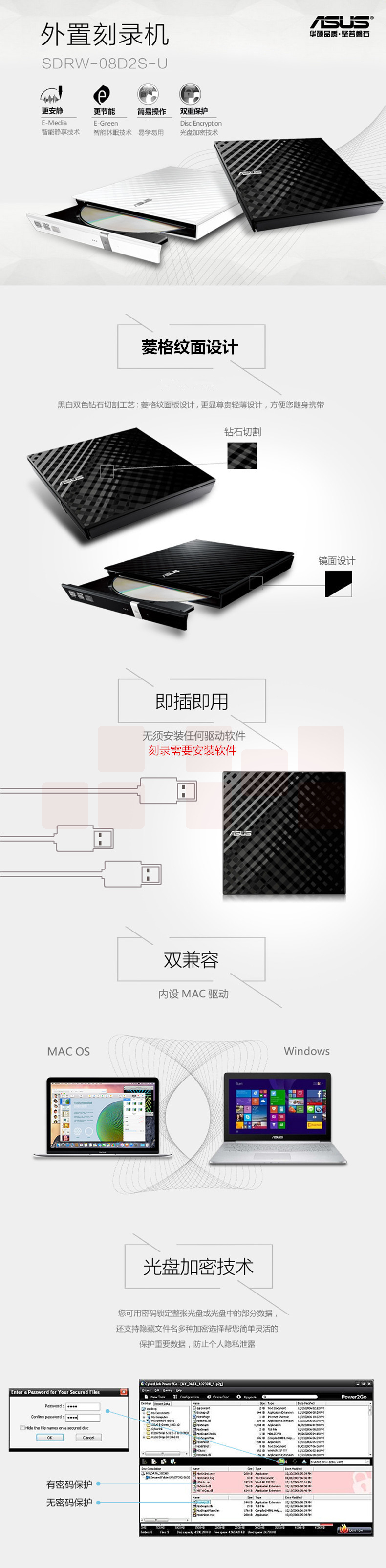华硕(ASUS) 8倍速 USB2.0 外置DVD刻录机 移动光驱 黑色(兼容苹果系统/SDRW-08D2S-U)