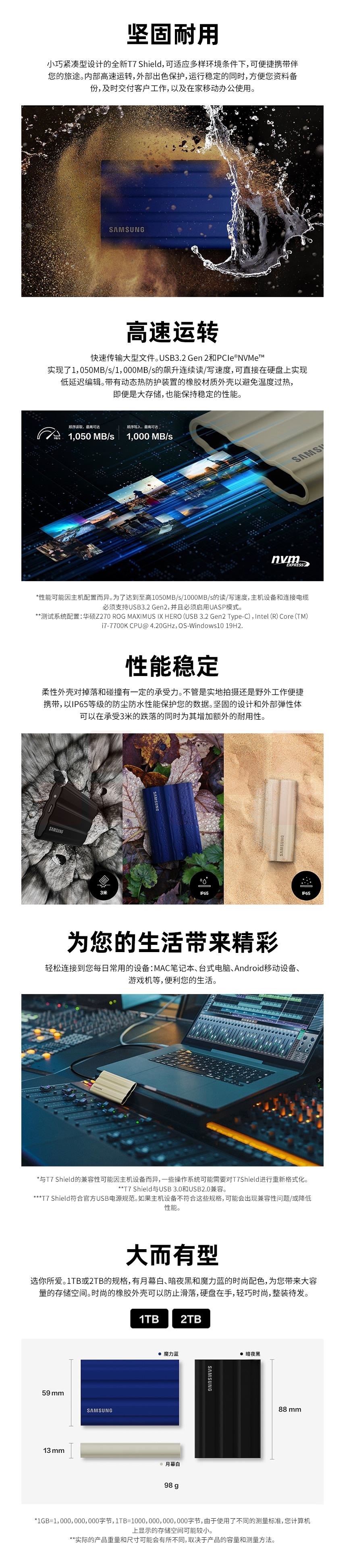 三星 1TB Type-c USB 3.2 移动固态硬盘(PSSD)T7 Shield 月慕白 NVMe传输