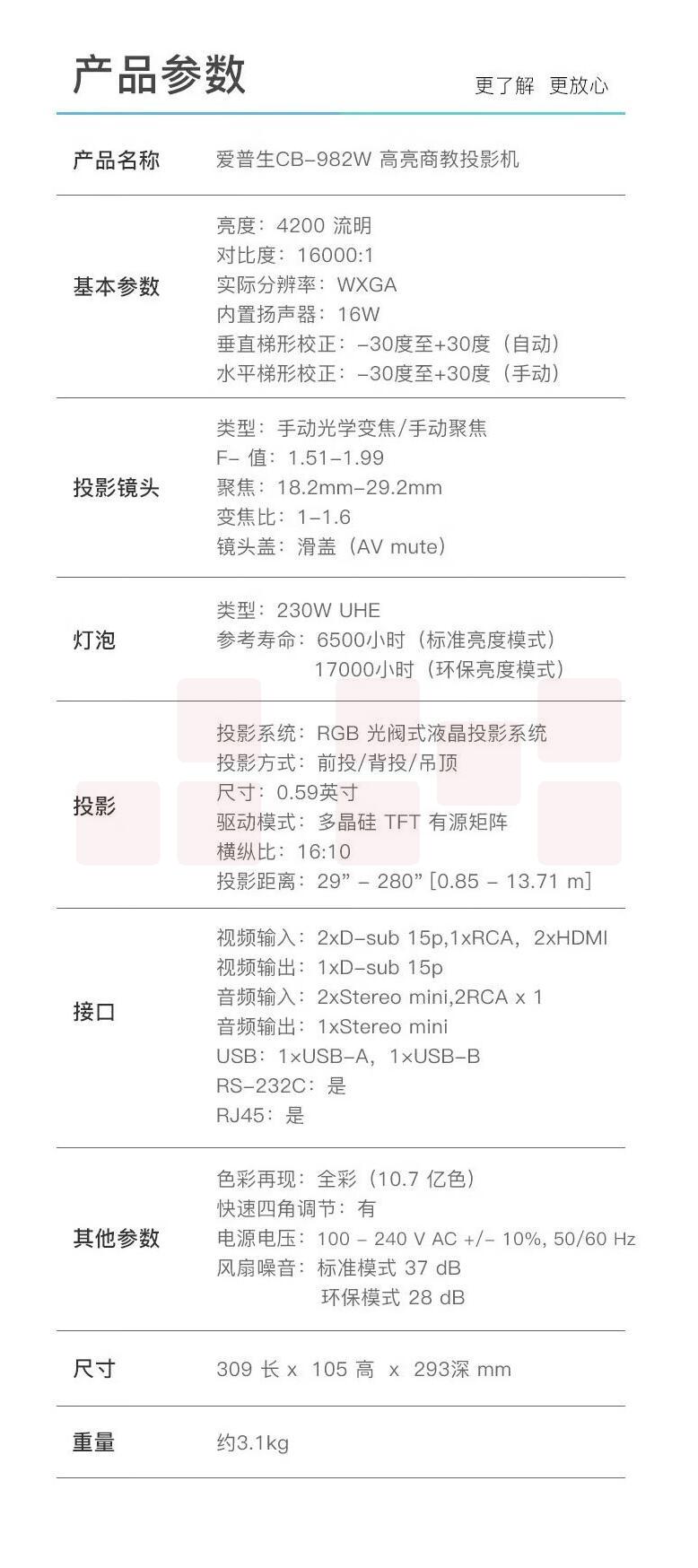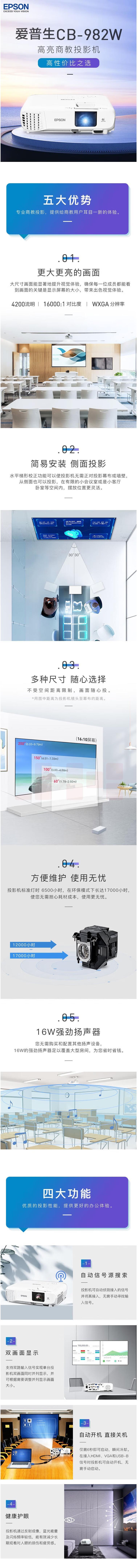 爱普生 CB-982W 投影仪 投影机(4200流明 高清 双HDMI接口 支持侧面投影)