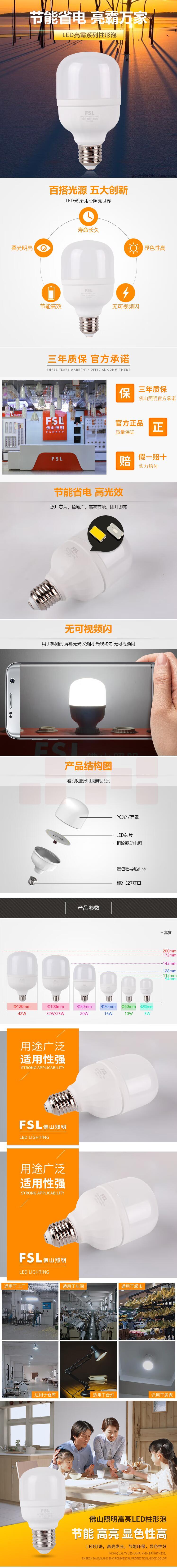 佛山照明 LED球泡10W 柱形亮霸灯泡220V-E27-6500K白光