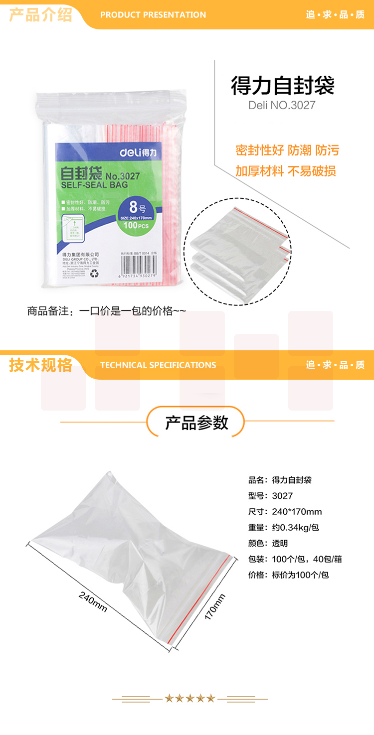 得力 自封袋 240*170mm 100个/包 3027密封袋