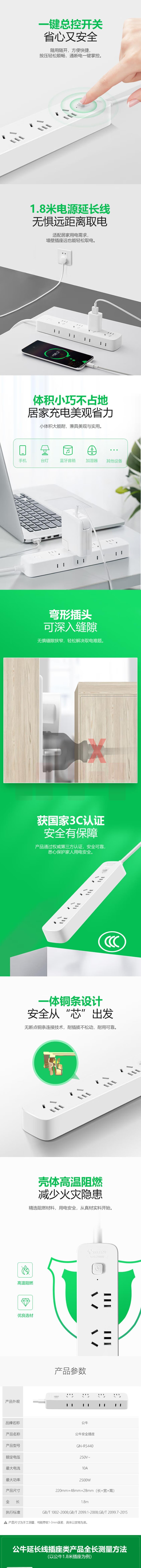 公牛 GN-R5440 8位总控1.8米 新国标插座/插线板/插排/排插/接线板/拖线板