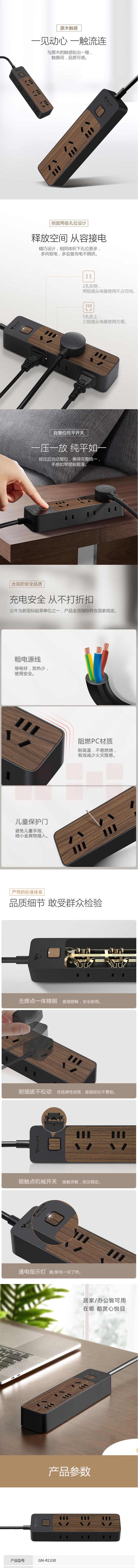 公牛 GN-R1330 6位总控1.8米 新国标插座/插线板/插排/排插/接线板/拖线板黑色木纹