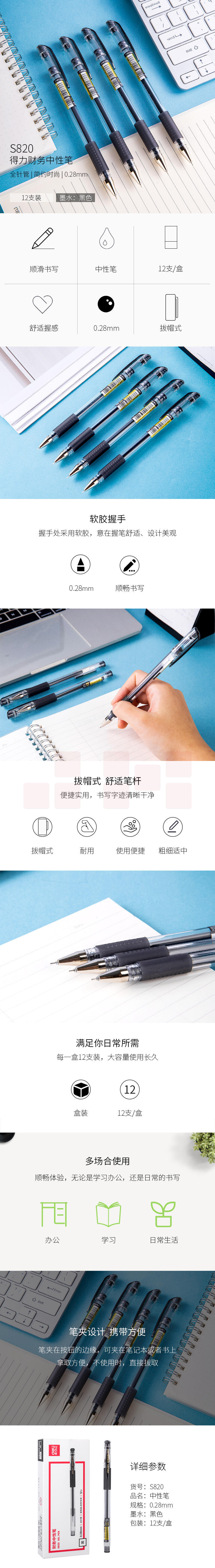 得力S820财务中性笔0.28mm全针管记账笔(黑)12支