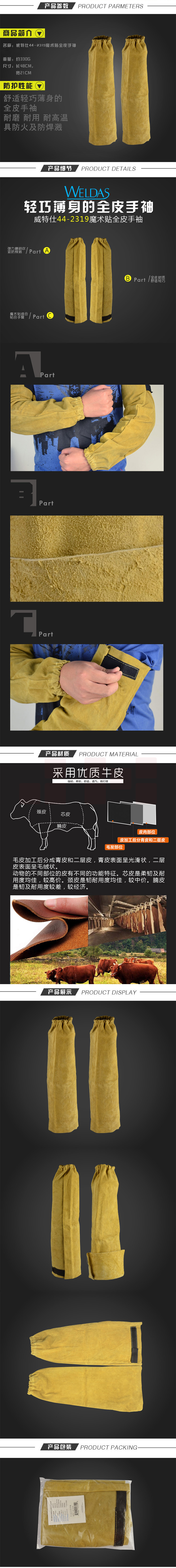 威特仕 / WELDAS 44-2319纯牛皮电焊烧焊专用套袖 48cm长隔热耐磨防金属飞溅牛皮套袖 1副