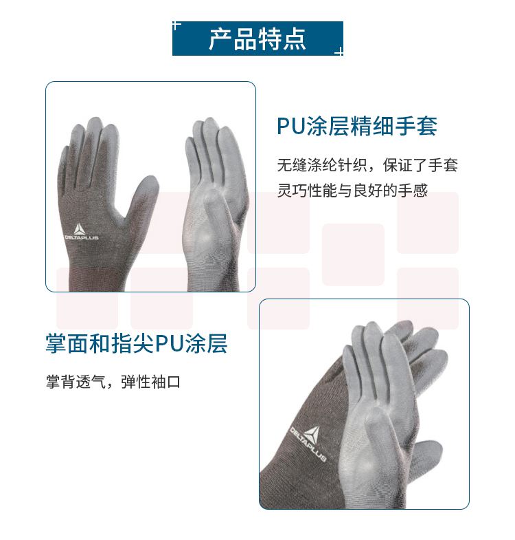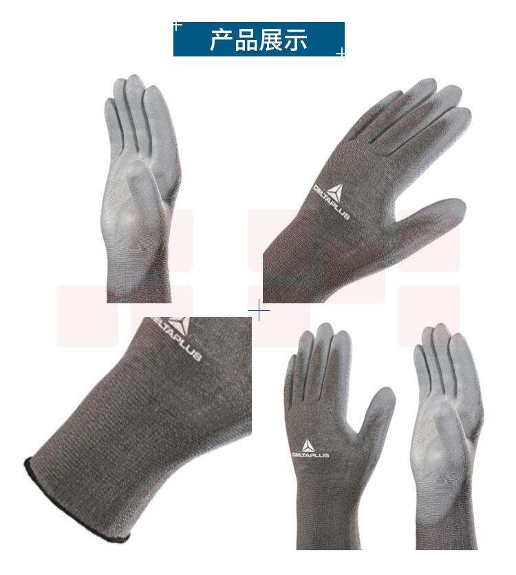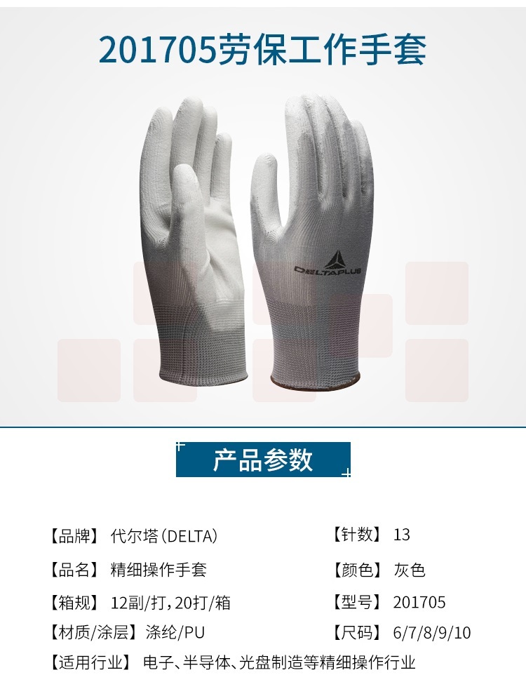 代尔塔201707 PU涂层13针透气耐磨精细操作手套 灰/黑色 尺码8/9码