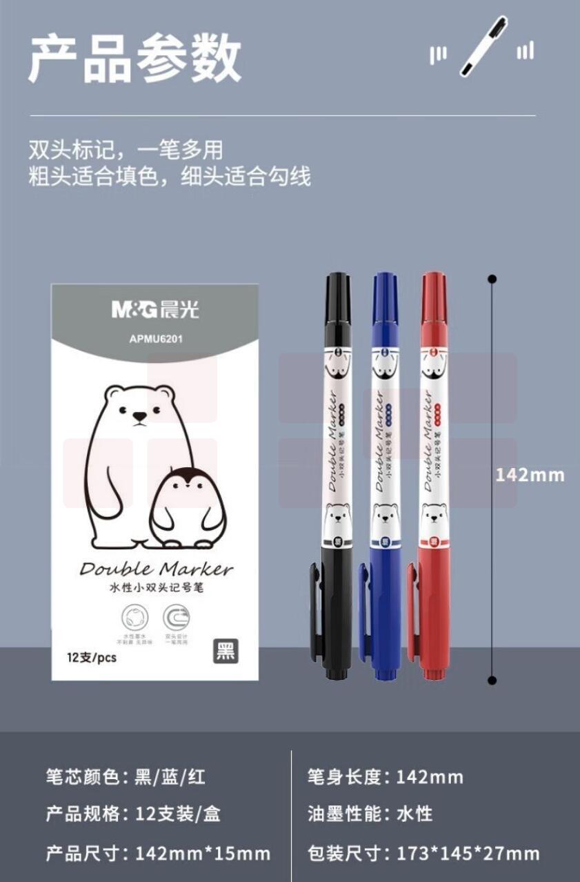 晨光 12支装 水性小双头记号笔APMU6201 黑色