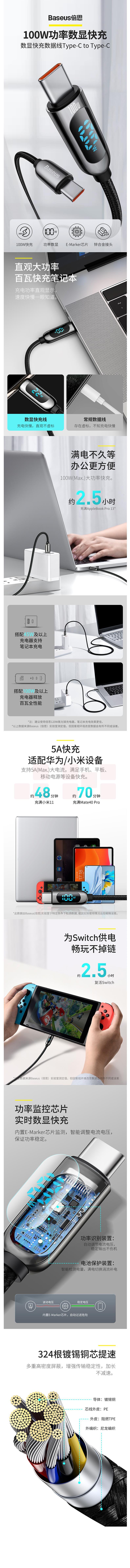 倍思 双头Type-C数据线 PD100W快充 智能数显 1米黑 货号:YC