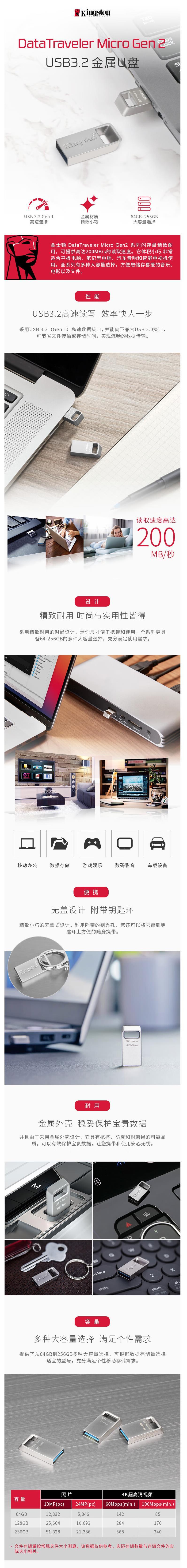 金士顿(Kingston)256GB USB3.2 Gen1 U盘 DTMC3G2 银色金属 迷你型车载U盘 读速200MB/s