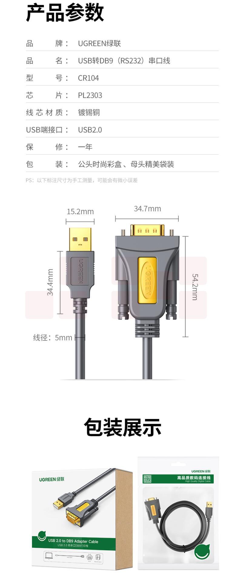 绿联(UGREEN)USB转RS232串口线 USB转DB9针公头转接线 3米 20223