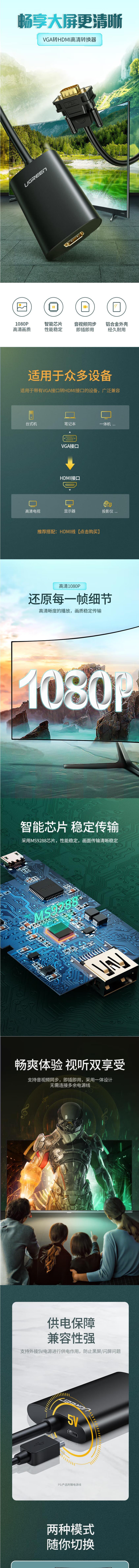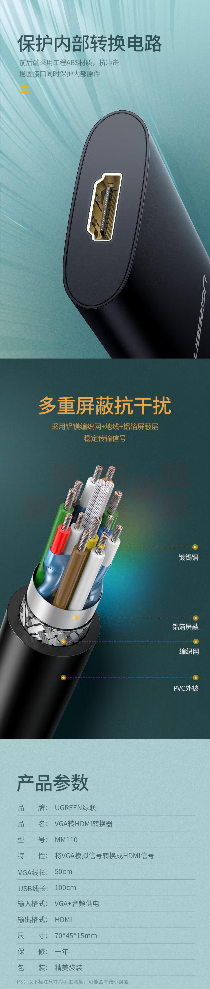 绿联 MM110 VGA转HDMI 转换器 带音频接口 视频转接头 40264