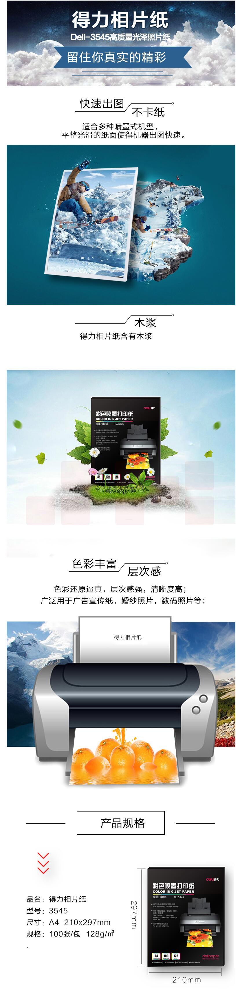 得力(deli)3545 A4 128g 彩色喷墨打印纸 100张/包相片纸照片打印