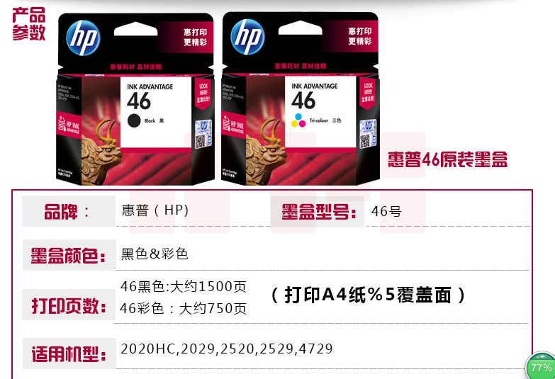 惠普(HP)46墨盒 适用HP 2029/2020/2520/2529hc CZ637AA 46黑色/彩色/单只